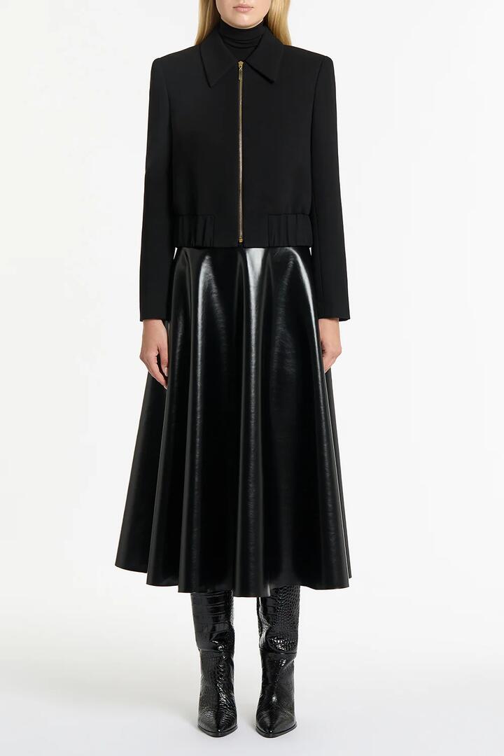 Clean, simple lines characterise this jacket with a sophisticated, modern allure that recalls the classic bomber silhouette. This style made from signature crepe, contrasted against the statement gold zip and rouched hem.