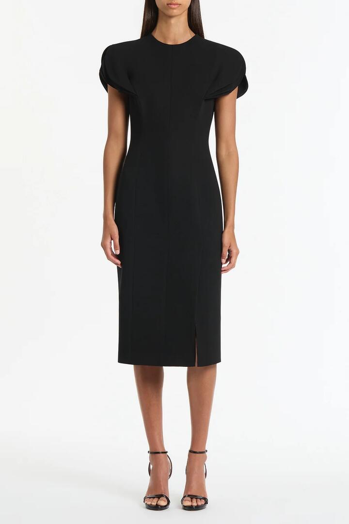 BLACK CREPE PETAL SLEEVE FITTED DRESS