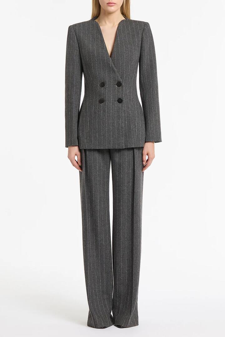 Crafted from Italian wool, this blazer features a clean lapel double-breasted design that is accentuated by delicate pin-stripes. The body is framed by four black buttons and collar finished with a curved neckline. Pair with matching wool pants for a timeless set.