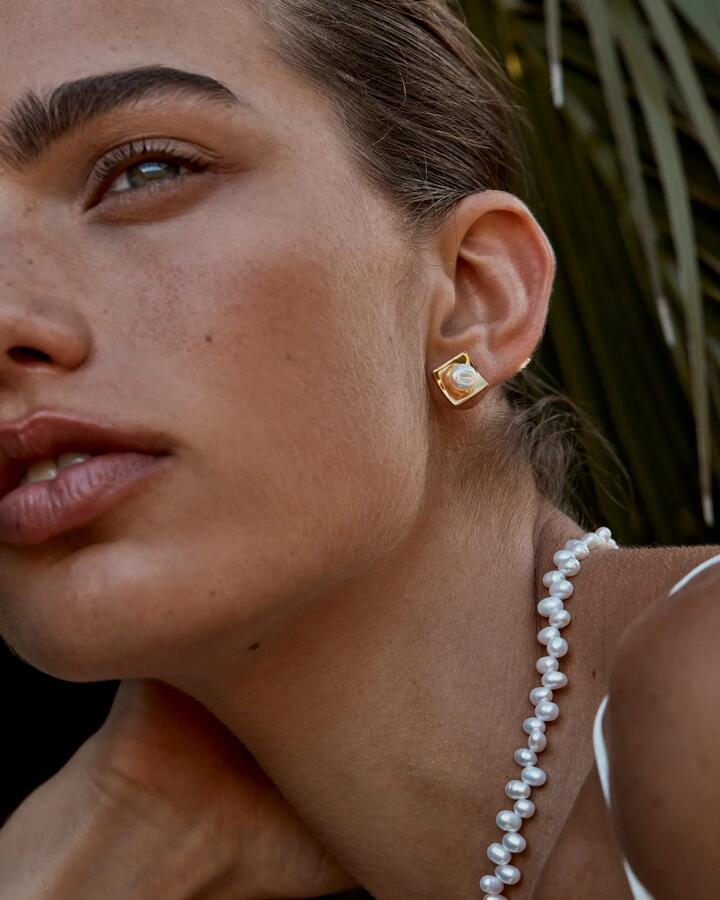The Lantana Earrings present a polished square design serving as a platform to showcase a lustrous AAA+ freshwater Pearl. Handcrafted in Italy.