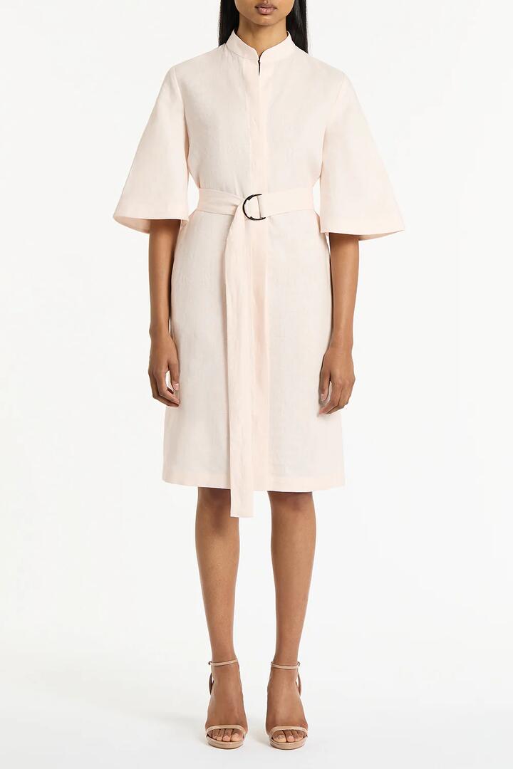 Shirt dresses have long been a cornerstone of the High Summer womenswear collections. This chic piece is crafted from naturally lightweight linen in pale pink and designed with an extended collar, d-ring belt and pockets.