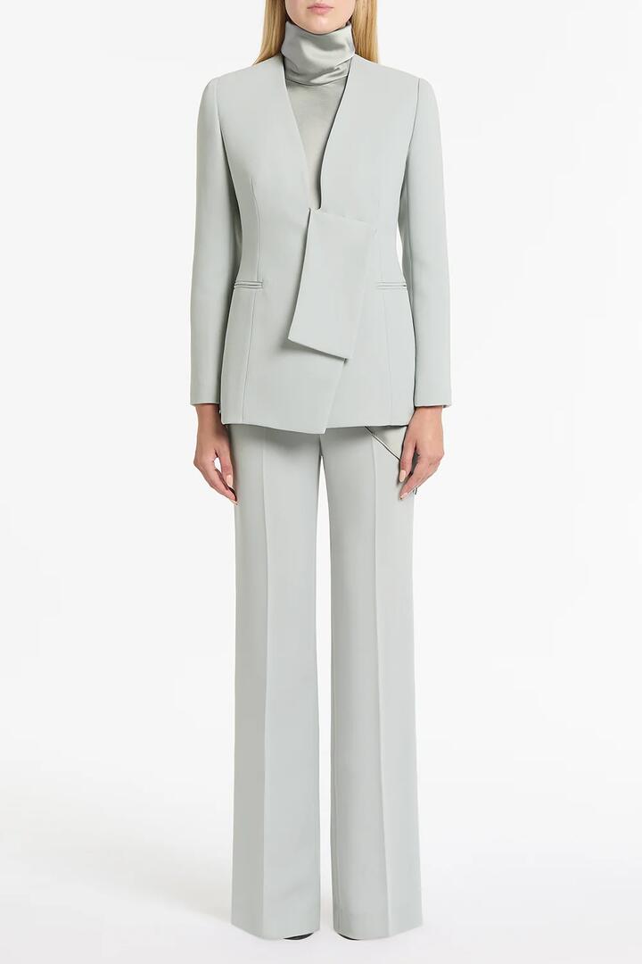 The Silver Crepe Striscia Blazer is cut in a flattering long-line silhouette, tailored to emphasise the waist. The luxury crepe offers an effortless finish, while the front sculptural panel offsets the classic design with a modern twist. Pair with tailored trousers for an sleek ensemble.