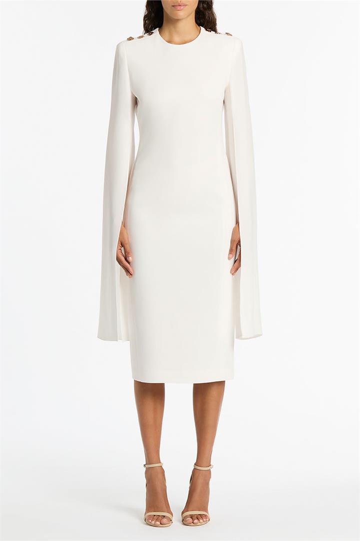 The classic cape sleeve silhouette is reimagined for AW23 with custom gold buttons that frame the top of the shoulders. The split sleeve dramatically drapes longer than arm length to create lengthening lines. Pair with a stiletto and hose for a chic evening ensemble.